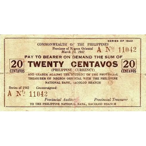 | Vorderseitenlegende | COMMONWEALTH OF THE PHILIPPINES PROVINCE OF THE NEGROS ORIENTAL MARCH 19, 1942 PAY THE BEARER ON DEMAND THE SUMO OF TWENTY CENTAVOS 20 CENTAVOS (PHILIPPINE CURRENCY) AND CHARGE AGAINST THE ACCOUNT OF THE PROVINCIAL TREASURER OF NEGROS ORIENTAL WITH THE PHILIPPINES NATIONAL BANK, BACOLOD BRANCH SERIES OF 1942 TO THE PHILIPPINE NATIONAL BANK, BACOLOD BRANCH |
