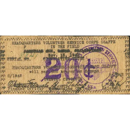 | Obverse lettering | HEADQUARTERS VOLUNTEER SERVICE CORPS USAFFE IN THE FIELD PAMBUJAN SUR, SAMAR, PHILIPPINES NOV 15, 1942 CIRCULATING NOTES HAEDQUARTERS VOLUNTEER SERVICE CORPS USAFFE will pay the bearer in demand TWENTY CENTAVOS 20¢ Finance Officer Commanding Officer Adjutant |