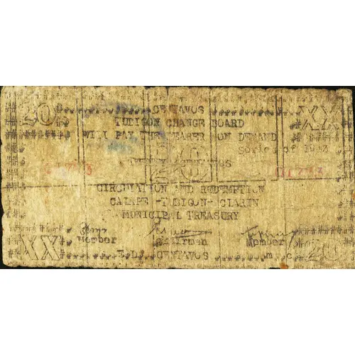 | Obverse lettering | 20 CENTAVOS XX TUBIGON CHANGE BOARD WILL PAY THE BEARER ON DEMAND TWENTY CENTAVOS 20 CIRCULATION AND REDEMPTION CALAPE - TUBIGON - CLARIN MUNICIPAL TREASURY XX CENTAVOS 20 |