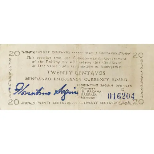 | Legenda del rovescio | TWENTY CENTAVOS ISSUED BY THE MINDANAO EMERGENCY CURRENCY BOARD PHILIPPINES THIS NOTE IS REDEEMABLE AT FACE VALUE AFTER THE EMERGENCY AND WILL NOT BE DEVALUATED OR DISCRIMINATED AGAINST COUNTERFEITING OF THIS NOTE WILL BE SEVERELY PUNISHED TWENTY |