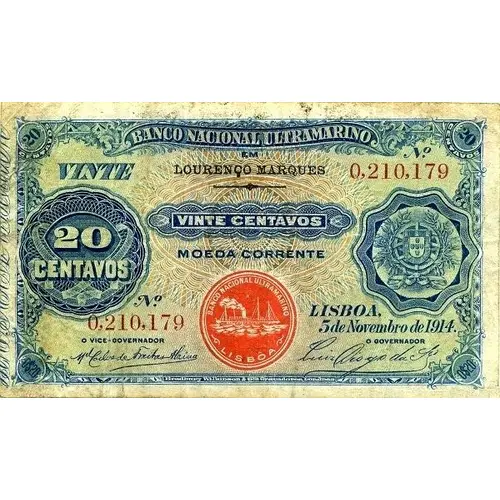 | نوشتههای روی اسکناس | BANCO NACIONAL ULTRAMARINO EM LOURENÇO MARQUES VINTE CENTAVOS MOEDA CORRENTE |