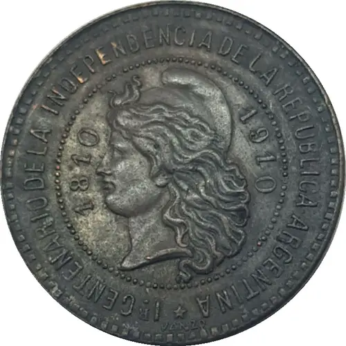 | Obverse lettering | Ir. CENTENARIO DE LA INDEPENDENCIA DE LA REPUBLICA ARGENTINA 1810 1910 |