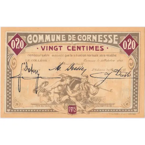 COMMUNE DE CORNESSE 0,20 0,20 VINGT CENTIMES remboursable aussitôt que la situation normale soit rétablie Cornesse le 31 Octobre 1915 LE COLLÈGE : Le Bourgmestre ff L`Echevin des Finances ff Le Secrétaire : (trois signatures) VOIR AU VERSO LE CARACTERE D`AUTHENCITE 1915 L J. CROUQUET & FILS. VERVIERS. |