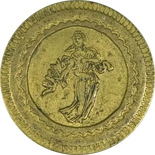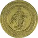 Opis awersu Standing woman in long dress and large scarf, in a listel wavy on the inside and striated on the outside.