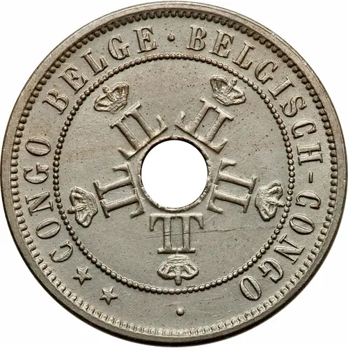| Obverse description | Five monograms of Leopold II form a star. The name of the country in French and Dutch. |