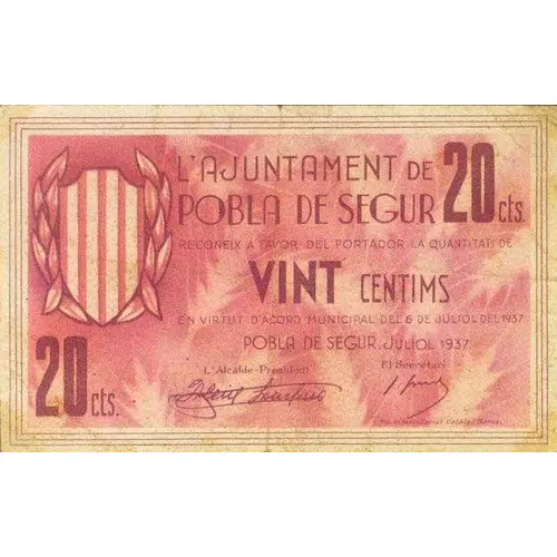 20 cts. L`AJUNTAMENT DE POBLA DE SEGUR RECONEIX A FAVOR DEL PORTADOR LA QUANTITAT DE VINT CENTIMS EN VIRTUT D`ACORD MUNICIPAL DEL 6 DE JULIOL DEL 1937 POBLA DE SEGUR, JULIOL 1937 (Translation: 20 Centimos The City Council of Pobla de Segur Recognizes in favor of the bearer the amount of Twenty Centimos According to municipal agreement of July 6, 1937 Pobla de Segur, July 1937) |