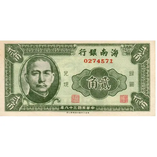 | Obverse lettering | (Translation: Hainan Bank Twenty Cents Year 38 of the Chinese Republic) |
