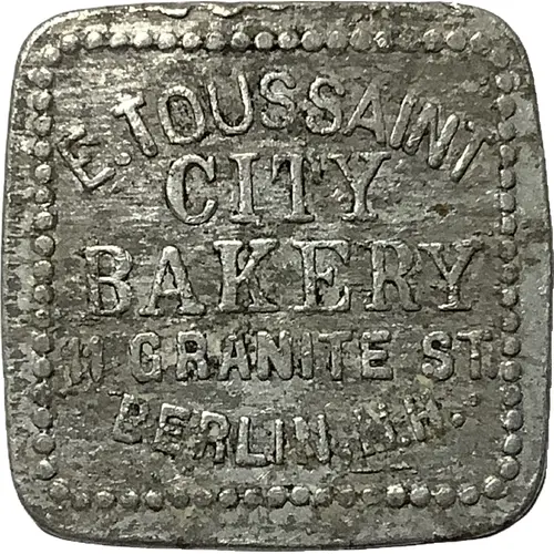 | Obverse lettering | E. TOUSSAINT CITY BAKERY 11 GRANITE ST. BERLIN N.H. |
