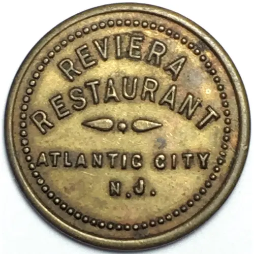 | Obverse description | A circle of dots around the edge with REVIERA RESTAURANT on the top half, divider marking in the middle, ATLANTIC CITY N.J. covering the bottom half |