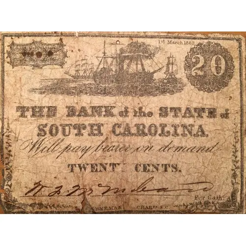 | Obverse lettering | 1st March 1862 The Bank of the State of South Carolina Will pay bearer on demand Twenty Cents. _________________ For Cashr. |