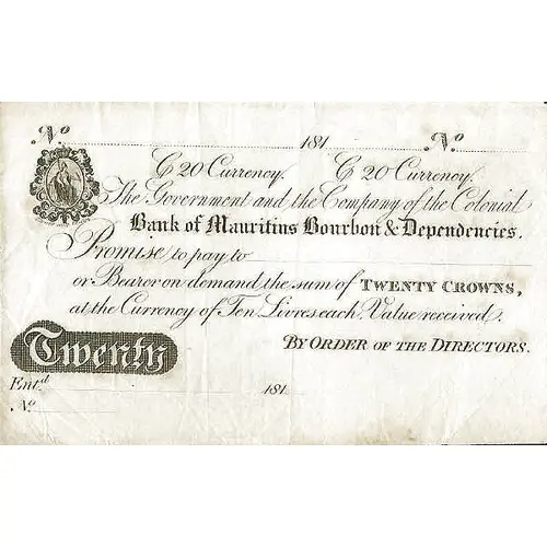 | Obverse lettering | THE GOVERNMENT OF THE COMPANY OF THE COLONIAL BANK OF MAURITIUS BOURBON AND DEPENDENCIES PROMISE TO PAY THE BEARER ON DEMAND THE SUM OF TWENTY CROWNS AT THE CURRENCY OF TEN LIVRES EACH VALUE RECEIVED TWENTY |
