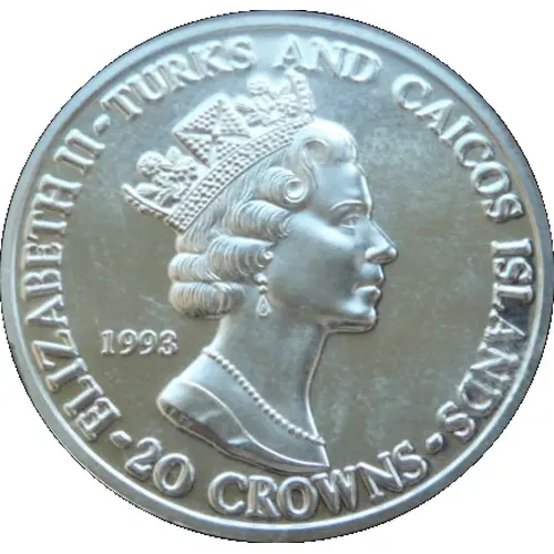 | Obverse lettering | -ELIZABETH II - TURKS AND CAICOS ISLANDS - 1993 20 CROWNS |