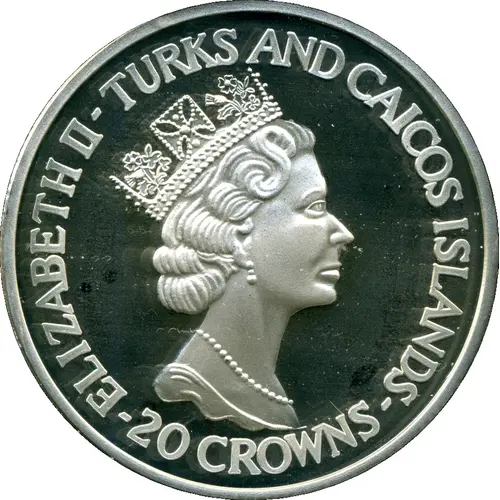 | Obverse lettering | ELIZABETH II-TURKS AND CAICOS ISLANDS -20 CROWNS- |