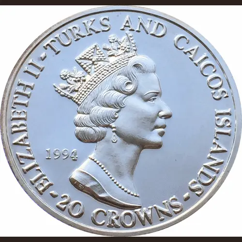| Obverse lettering | ELIZABETH II TURKS AND CAICOS ISLANDS 1994 -20 CROWNS- |