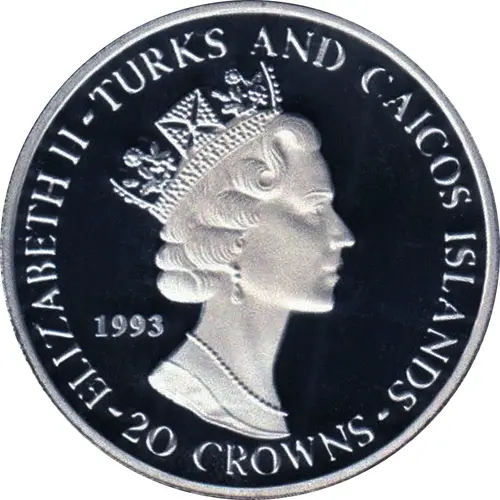 | Obverse lettering | ELIZABETH II · TURKS AND CAICOS ISLANDS 1993 · 20 CROWNS · |
