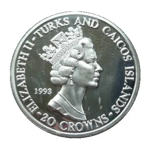 | Obverse lettering | ELIZABETH II.TURKS AND CAICOS ISLANDS 1993 20 CROWNS |