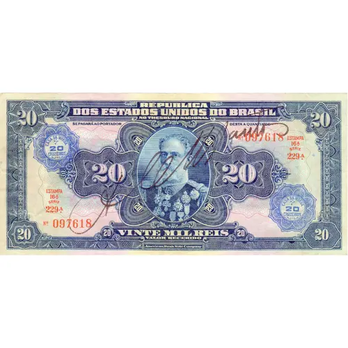 | Obverse lettering | 20 20 REPUBLICA DOS ESTADOS UNIDOS DO BRASIL NO THESOURO NACIONAL SE PAGARÁ AO PORTADOR DESTA A QUANTIA DE 20 20 CASA DA MOEDA 20 CRUZEIROS 20 20 CASA DA MOEDA 20 CRUZEIROS 20 20 20 VINTE MIL REIS 20 VALOR RECEBIDO 20 20 AMERICAN BANK NOTE COMPANY (Translation: Republic of the United States of Brazil In the National Treasury Mint 20 Cruzeiros will be paid to the carrier of this amount of Twenty Thousand Réis Amount Received American Bank Note Company) |