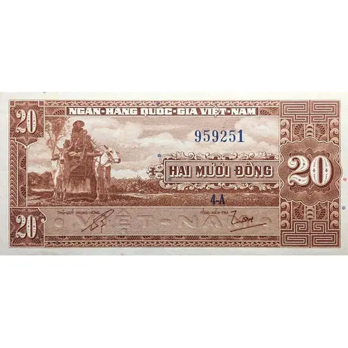 | Obverse lettering | NGÂN-HÀNG QUỐC-GIA VIỆT-NAM HAI MƯƠI ĐỒNG 20 THỦ-QUỸ TRUNG ƯƠNG TỔNG-KIỂM-TRA VIỆT-NAM (Translation: National Bank of the State of Vietnam. Twenty đồng. 20. Central Cashier. Chief Inspector. Vietnam.) |