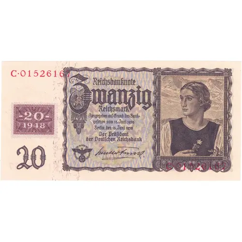 | Obverse lettering | Reichsbanknote Zwanzig Reichmark Ausgegben auf Grund des Bank gesetzes vom 15.Juni 1939 Berlin, den 16 Juni 1939 Der Präſident der Deutschen Reichsbank (Translation: Reichsbank note Twenty Reichsmark Issued on the basis of the banking law of June 15, 1939 Berlin, June 16, 1939 President of the German Reichsbank) |