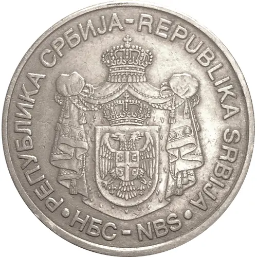 The large coat of arms of Serbia. In the periphery, the inscription `Repubic of Serbia` in Cyrillic and Latin alphabet. НБС - NBS for National Bank of Serbia. |