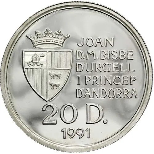 | Obverse lettering | JOAN D.M.BISBE D`URGELL I PRINCEP D`ANDORRA 20 D. 1991 (Translation: Joan D.M. Bishop of Urgell and Prince of Andorra) |