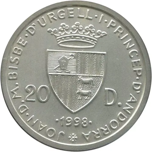 | نوشتههای روی سکه | JOAN · D.M. BISBE · D`URGELL · I · PRINCEP · D`ANDORRA 20 D. · 1998 · (Translation: Joan D.M. Bishop of Urgell and Prince of Andorra) |