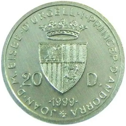| Legenda del dritto | JOAN · D.M. BISBE · D`URGELL · I · PRINCEP · D`ANDORRA 20 D. · 1999 · (Translation: Joan D.M. Bishop of Urgell and Prince of Andorra) |