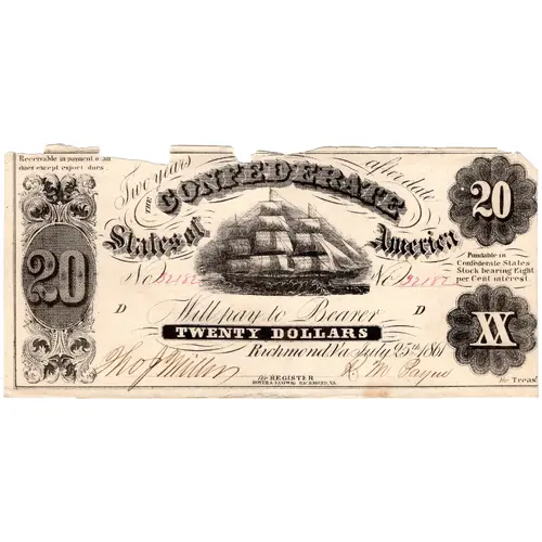 | Obverse lettering | Receivable in payment of all dues except export dues. Two years after date the CONFEDERATE STATES OF AMERICA No *Serial Number* (Twice) Fundable in Confederate States Stock bearing Eight per Cent interest. Will pay to Bearer TWENTY DOLLARS Richmond, Va. July 25th, 1861 for REGISTER HOYER & LUWIG RICHMOND, VA. |