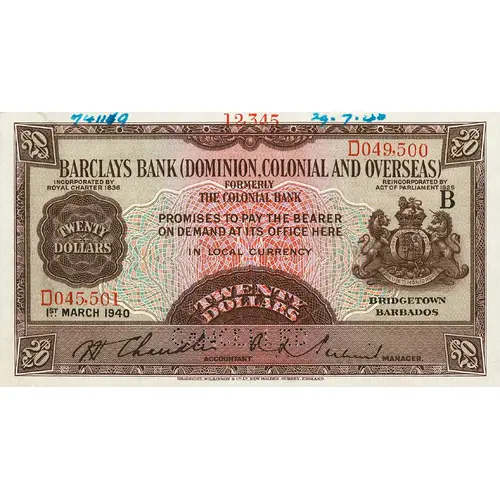| Opschrift voorzijde | BARCLAYS BANK (DOMINION COLONIAL AND OVERSEAS) FORMERLY THE COLONIAL BANK PROMISE TO PAY THE BEARER ON DEMAND AT ITS OFFICE HERE IN LOCAL CURRENCY TWENTY DOLLARS INCORPORATED BY ROYAL CHARTER 1836 REINCORPORATED BY ACT OF PARLIAMENT 1925 BRIDGETOWN BARBADOS 1ST MARCH 1940 ACCOUNTANT MANAGER $20 HONI SOIT QUI MAL Y PENSE DIEU ET MON DROIT BRADBURY, WILLKINSON & Co. Ltd. NEW MALDEN, SURREY, ENGLAND (Translation: Shamed be the one who thinks ill of it. God and my right.) |