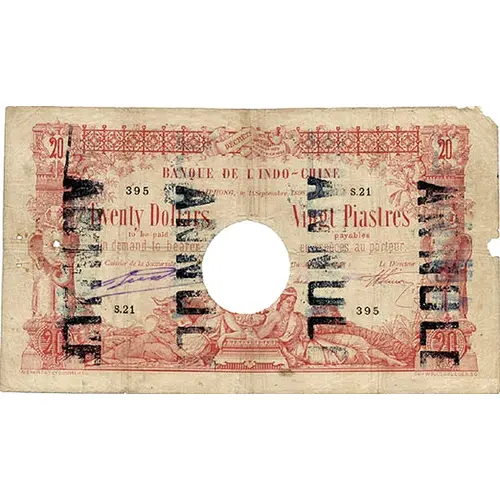 BANQUE DE L`INDO-CHINE HAIPHONG TWENTY DOLLARS VINGT PIASTRES TO BE PAID ON DEMAND TO BEARER PAYABLES EN ESPÈCES AU PORTEUR A. BRAMTOT ET G. DUVAL-FEC. CH.WULLSCHLEGER SC. |