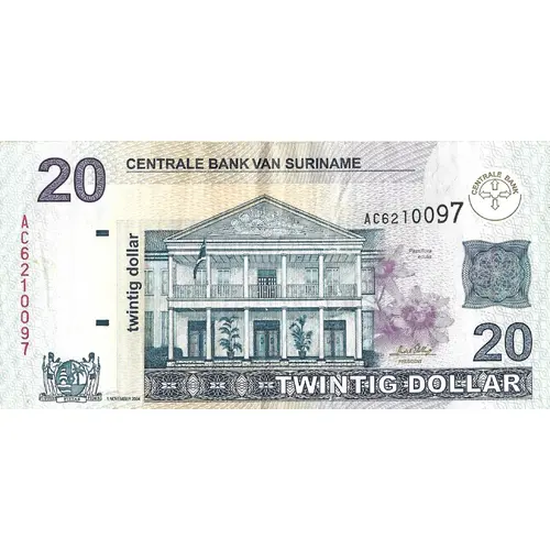 | Arka yüz lejandı | CENTRALE BANK VAN SURINAME Rhizophora mangle Voltzberg TWINTIG DOLLAR NADRUK VERBODEN: SURINAAMS WETBOEK VAN STRAFRECHT ARTIKEL 260 (Translation: Central Bank of Suriname Rhizophora mangle Voltzberg Twenty Dollars Counterfeiting Forbidden: Suriname Criminal Law, Article 260) |