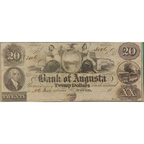 | Obverse lettering | 20 STATE OF GEORGIA 20 The President Directors & Co of THE Bank of Augusta Promise to pay Twenty Dollars on demand to _____ or bearer. AUGUSTA,______18_____ TWENTY ___________ Cash. ___________ President. XX Rawdon, Wright, Hatch & Edson, New York. |