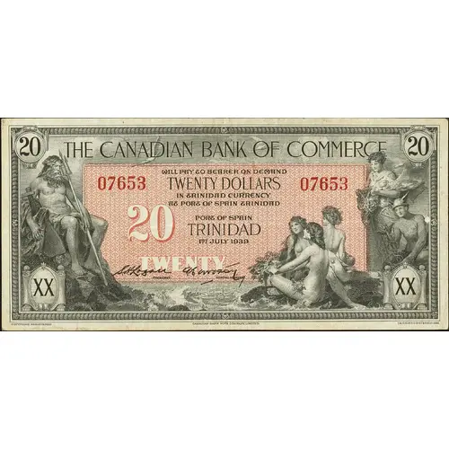 | Obverse lettering | THE CANADIAN BANK OF COMMERCE WILL PAY TO THE BEARER ON DEMAND TWENTY DOLLARS IN TRINIDADCURRENCY AT PORT OF SPAIN TRINIDAD PORT OF SPAIN TRINIDAD 1st July 1939 |