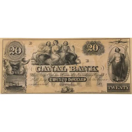 | Obverse lettering | 20 CANAL BANK The New Orleans Canal & Banking Company will pay TWENTY DOLLARS to the bearer on demand. New Orleans __________ 18____ __________ Cash.ʳ __________ Pres.ᵗ |