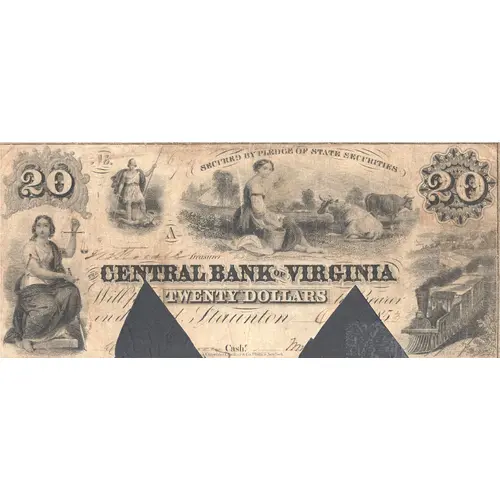 | Obverse lettering | THE CENTRAL BANK OF VIRGINIA Will pay TWENTY DOLLARS to Bearer on demand. STAUNTON ______ 185_ |