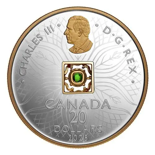Enhanced with selective gold plating, the reverse is a representation of the Earth element in nature. A spring blossom contained within a bulb-like shape symbolizes nature’s cyclical renewal; as a repeating motif, it forms the petals of a larger flower shape, while the overlapping arrangement of tree branches and roots is representative of steadfast growth. At the centre, a standard grade ammolite that has been ethically sourced from Alberta’s Bearpaw Geological Formation is set in a 3D mount fashioned by Canadian jewellery manufacturer Beverly Hills Jewellers; the gold-plated setting allows the suspended gemstone to “dance” at the slightest movement of the coin base. |