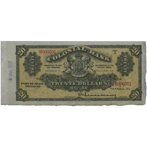 COLONIAL BANK PROMISE TO PAY THE BEARER ON DEMAND AT ITS OFFICE HERE INCORPORATED BY ROYAL CHARTER 1836 TWENTY DOLLARS PORT OF SPAIN TRINIDAD |