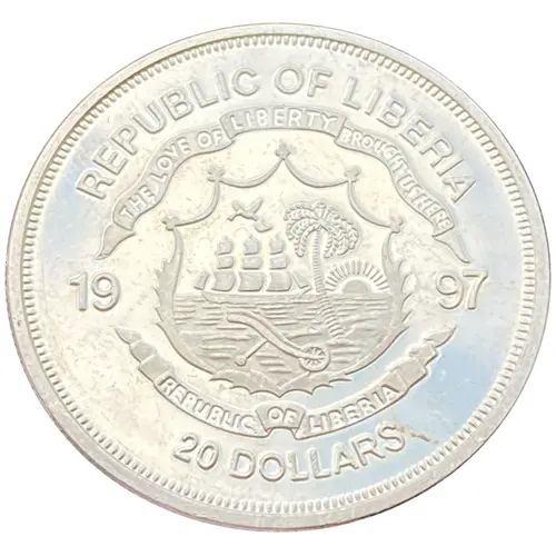 | Obverse lettering | REPUBLIC OF LIBERIA THE LOVE OF LIBERTY BROUGHT US HERE 19 97 REPUBLIC OF LIBERIA 20 DOLLARS |