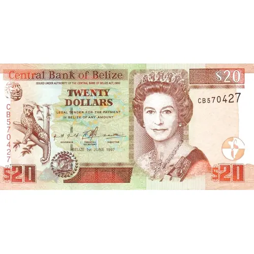 | Leyenda del reverso | Central Bank of Belize Twenty Dollars ANIMALS OF BELIZE $20 THOMAS DE LA RUE AND COMPANY LIMITED |