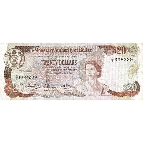 Obverse lettering The Monetary Authority of Belize ISSUED UNDER AUTHORITY OF ORDINANCE NO.9 OF 1976 TWENTY DOLLARS LEGAL TENDER FOR THE PAYMENT IN BELIZE OF ANY AMOUNT BELIZE, 1st JUNE 1980 LARGEST BARRIER REEF IN THE AMERICAS CHAIRMAN MANAGING DIRECTOR DIRECTOR SUB • UMBRA • FLOREO $20