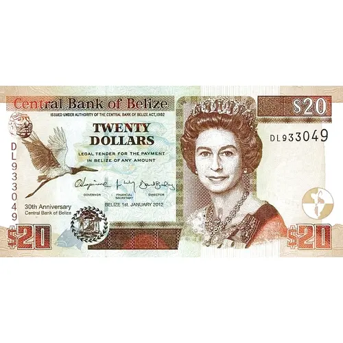Central Bank of Belize ISSUED UNDER AUTHORITY OF THE CENTRAL BANK OF BELIZE ACT. 1982 TWENTY DOLLARS LEGAL TENDER FOR THE PAYMENT IN BELIZE OF ANY AMOUNT GOVERNOR FINANCIAL SECRETARY DIRECTOR BELIZE, 1st. JANUARY 2012 30th Anniversary Central Bank of Belize SUB • UMBRA • FLOREO $20 (Translation: I flourish in the shade.) |