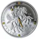 | Description du revers | Odin on his eight-legged horse, Sleipnir. One of Odin’s raven informants, Huginn (“Thought”), is perched on his shoulder while the other, Muninn (“Memory”), flies alongside him. His two wolf companions, Geri and Freki, also accompany him. Selective gold plating highlights Odin’s helmet, arm guard and infallible spear (Gungnir), as well as two different emblems. |