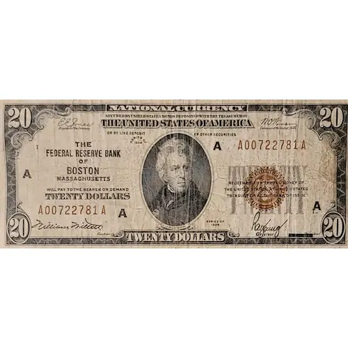 NATIONAL CURRENCY SECURED BY UNITED STATES BONDS DEPOSITED WITH THE TREASURER OF THE UNITED STATES OF AMERICA OR BY LIKE DEPOSIT OF OTHER SECURITIES THE FEDERAL RESERVE BANK OF (City) (State) WILL PAY THE BEARER ON DEMAND TWENTY DOLLARS REDEEMABLE IN LAWFUL MONEY OF THE UNITED STATES AT UNITED STATES TREASURY OR THE BANK OF ISSUE TWENTY DOLLARS |