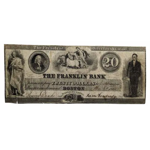 | Obverse lettering | The President, Directors and Co. of THE FRANKLIN BANK promise to pay TWENTY DOLLARS to or bearer on demand BOSTON 18 MASSACHUSETTS. CASH.ʳ PRES.ᵗ |