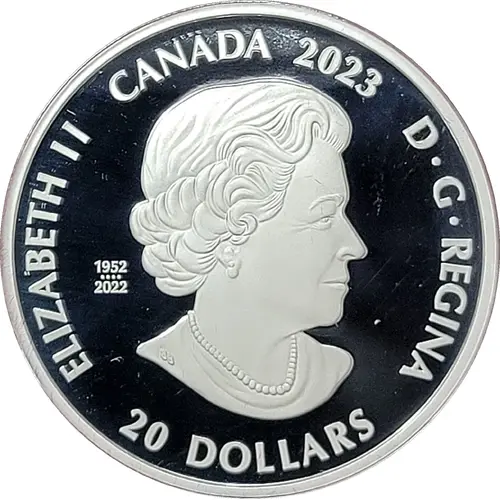 | Obverse lettering | ELIZABETH II CANADA 2023 D·G·REGINA 20 DOLLARS 1952 •••• 2022 SB (Translation: Elizabeth II, Queen by the grace of God) |