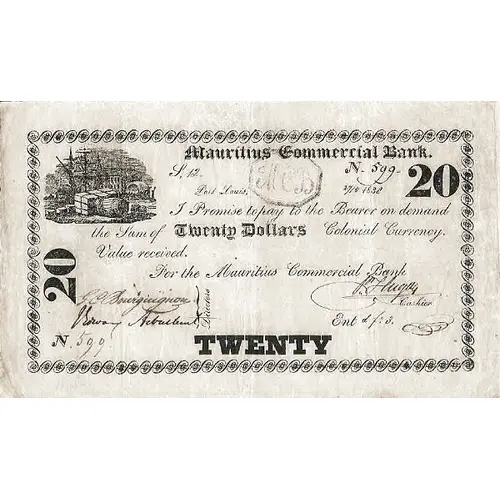 | Obverse lettering | MAURITIUS COMMERCIAL BANK I PROMISE TO PAY THE BEARER ON DEMAND THE SUM OF TWENTY DOLLARS COLONIAL CURRENCY VALUE RECEIVED FOR THE MAURITIUS COMMERCIAL BANK TWENTY |