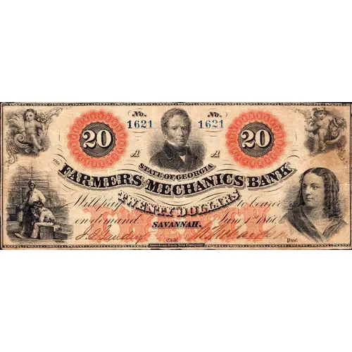 | Obverse lettering | STATE OF GEORGIA THE FARMERS AND MECHANICS BANK Will pay TWENTY DOLLARS to bearer on demand SAVANNAH, June 1st 1861 American Bank Note Company |