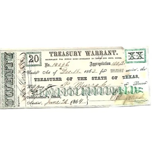 | Obverse lettering | TREASURY WARRANT Under Act of Dec,16 1863 for Military Service The Treasurer of the State of Texas Will Pay TWENTY DOLLARS To Comptroller’s Office, Austin Jun 20, 1864 |