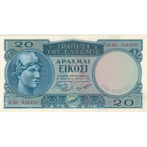 20 Α.10- 512 410 ΤΡΑΠΕΖΑ ΤΗΣ ΕΛΛΑΔΟΣ Αʹ ΔΡΑΧΜΑΙ ΕΙΚΟΣΙ Πληρωτέαι ἐπί τῇ ἐμφανίσει ΕΝ ΑΘΗΝΑΙΣ Τῌ 15η ΙΑΝΟΥΑΡΙΟΥ 1954 ΟΙ ΔΙΕΥΘΥΝΤΑΙ Ο ΔΙΟΙΚΗΤΗΣ ΝΕΑ ΕΚΔΟΣΙΣ Α.10- 512 410 20 |