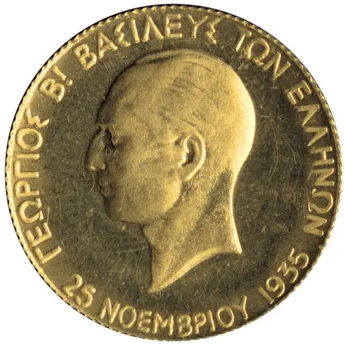| Obverse lettering | ΓΕΩΡΓΙΟΣ Β! ΒΑΣΙΛΕΥΣ ΤΩΝ ΕΛΛΗΝΩΝ 25 ΝΟΕΜΒΡΙΟΥ 1935 (Translation: George B! King of the Greeks 25th of November 1935) |